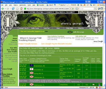 Where's George? is the website and home of a world-wide currency tracking project. Users mark bills with the address of the site, log the year and serial number, and then register them with the site. Any time the bill is found thereafter and entered into the site again (known as "hits"), the user is notified and can see where that note has been.